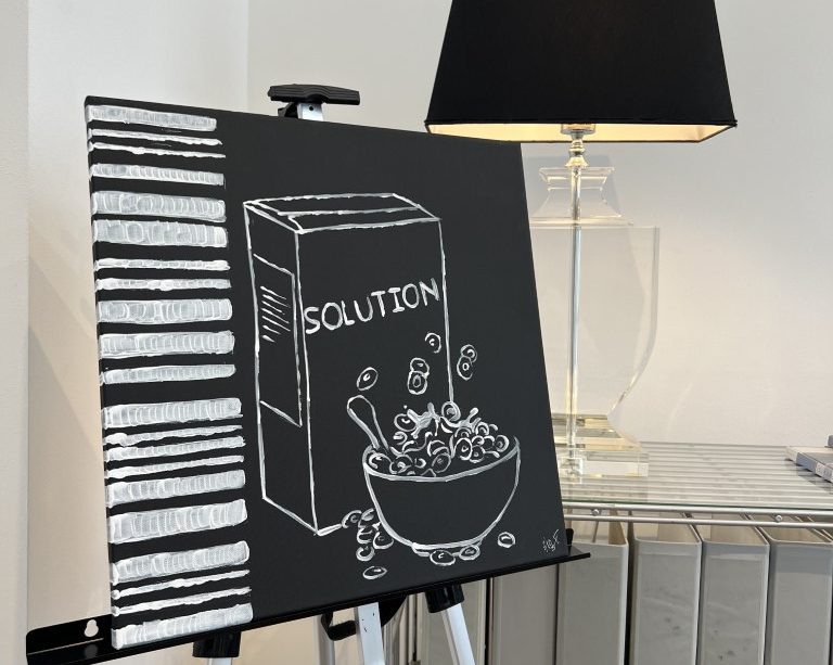 The milk carton, marked by imperfections, symbolizes challenges, while the resilient cereal ball signifies the innovative solution. In their visual dance, the mural encapsulates the profound notion that within every problem lies the seed of its own resolution.